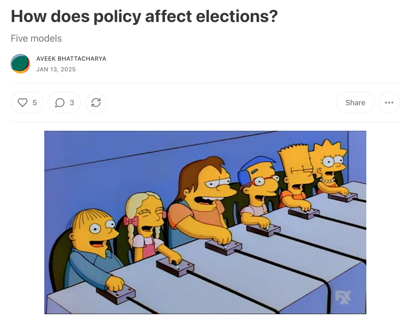 4) In his recent Substack article ‘How does policy affect elections?’, my friend Aveek Bhattacharya sets out a five-part taxonomy of theories purporting to explain the impact of policy on the way people vote. There’s popularism (people vote for parties proposing policies they like!), minefield-ism (people vote against parties proposing policies they dislike!), narrativism (people vote for party vibes rather than specific policies!), deliverism (people vote for parties that effect attractive policy change!), and fatalism (people vote for reasons non-related to policy!). I’m always suspicious of anyone claiming to know why a large group of people voted as they did, and particularly the sweeping claims you sometimes see like ‘Brexit was all about immigration!’, or ‘Trump tracks the urban/rural divide!’. But Bhattacharya’s taxonomy is really useful — as an overview of how policymakers view their routes to impact, and an acknowledgement of the epistemic puzzle at hand, if not a full explainer of the psephological psyche.