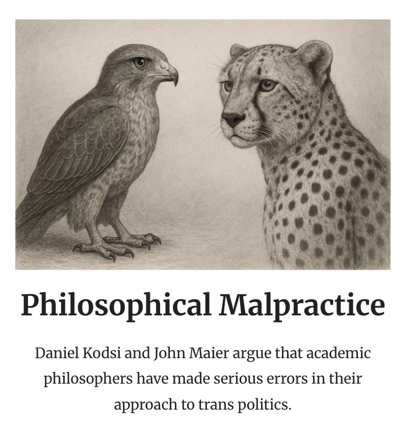 In the past, I used to write about these matters a lot — particularly in relation to my concerns about what I believe amounts to the mutilation of children’s bodies, and also about the ways in which philosophers have responded to the topic of gender identity more broadly. For various reasons, I don’t feel much need or desire to write about these things anymore. But I’m really glad that Kodsi and Maier wrote this piece.