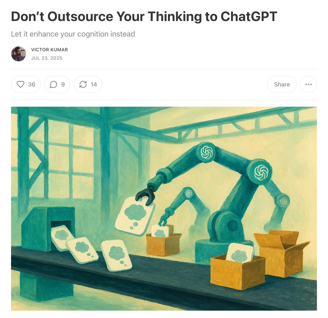1) This week I enjoyed reading Don’t Outsource Your Thinking to ChatGPT. This is a new article by Victor Kumar, published on his Substack, in which he makes two main arguments about the instrumental value of LLMs. First, Kumar argues that just because LLMs can be used for bad ends, this doesn’t mean we shouldn’t acknowledge and exploit their vast application value. “Wanting to ban LLMs because students use them to cheat”, he tells us, “is like wanting to outlaw cars because criminals use them as getaway vehicles”.