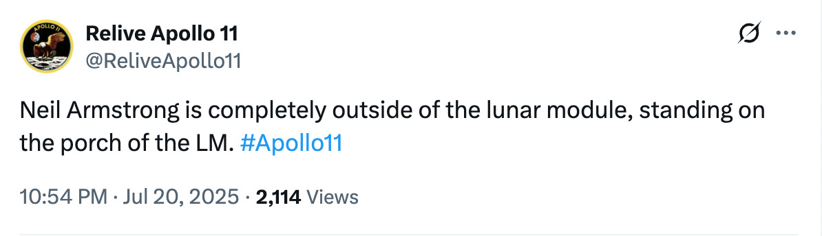 1) Yesterday was also the 56th anniversary of the moon landing. Over the past week, I’ve enjoyed following @ReliveApollo11. This is a Twitter account run by the DC Air and Space Museum, which recounted the Apollo 11 mission in real time last year, too. Some of the account’s tweets report on the geographical location of the craft and crew, some cover a broader set of facts about the mission and contemporaneous events, and some take the form of moving or amusing quotations.
