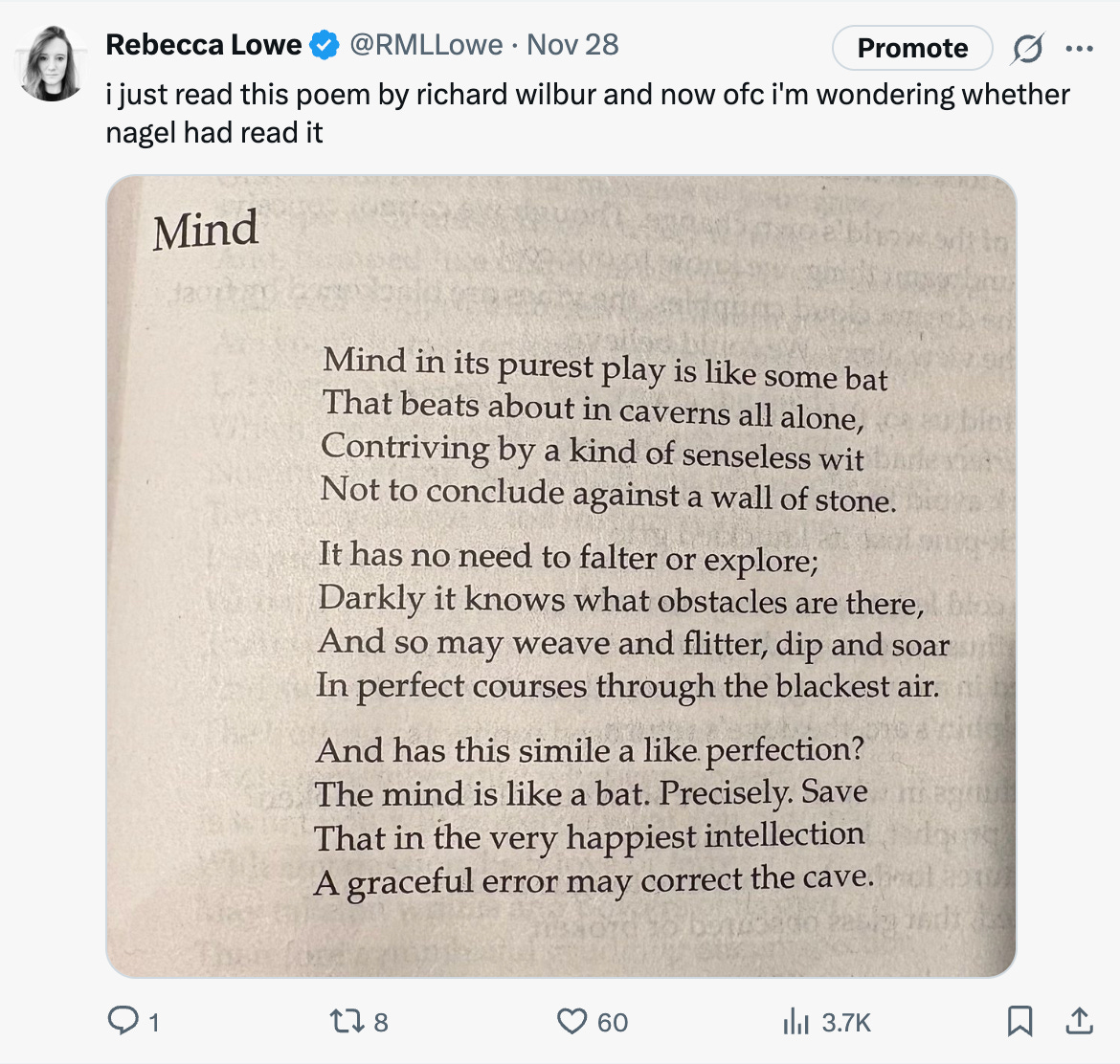 1) A couple of days ago I read a Richard Wilbur poem called Mind, which features a central bat analogy. This analogy made me wonder whether Thomas Nagel might’ve read the poem before he wrote What Is It Like to Be a Bat? (1974). It also made me think it was time I reread the Nagel paper, which is a strong contender for the best-known philosophy article of the last (almost) fifty years.
