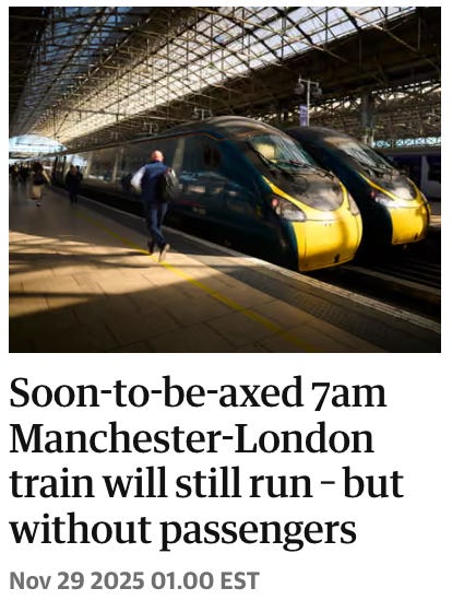 3) A few days ago, I read a Guardian article by Gwyn Topham about UK train services. If you’re like me, then nothing you read within or about this article could live up your experience of reading its title. So here’s the title: Soon-to-be-axed 7am Manchester-London train will still run – but without passengers. And here’s a link to the article, and to a follow-up article. I’ll leave it to you to decide whether you want to learn more. Ah England.