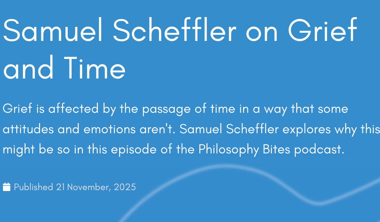 4) I enjoyed reading the transcript of this new Philosophy Bites episode on the topic of grief, featuring Dave Edmonds interviewing Samuel Scheffler. Scheffler focuses particularly on the anxiety that grievers sometimes feel when, after an initial intense period of grieving, they realise that increasingly “they’re able to get on with their lives”.