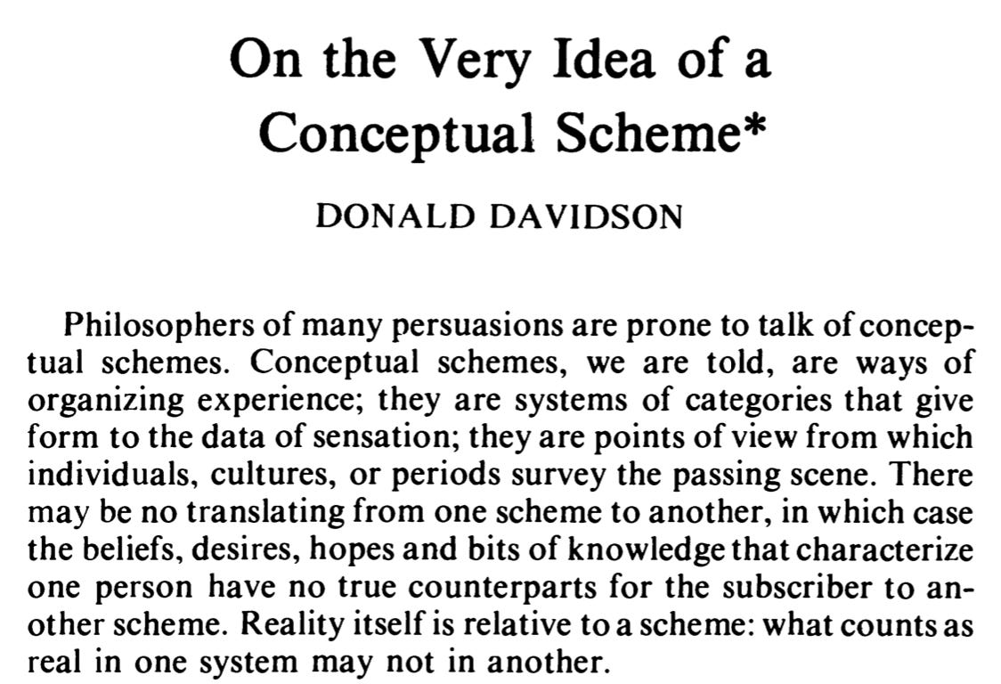 1) As part of my ongoing project of reading classic twentieth-century philosophy papers, this week I turned to Donald Davidson’s On the Very Idea of a Conceptual Scheme (1974). Here, Davidson argues against the ‘conceptual scheme’ concept, on the grounds of intelligibility.