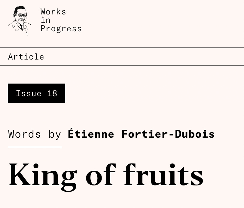 4) I enjoyed this new Works in Progress piece about pineapples. Étienne Fortier-Dubois describes the technological innovations that increased the European supply of this naturally hard-to-store and hard-to-cultivate fruit, long-valued for its taste and its look. I particularly liked learning that, in the nineteenth century, a “rental industry of pineapples arose to meet [the] demand” for using them as table-toppers, to signify status.