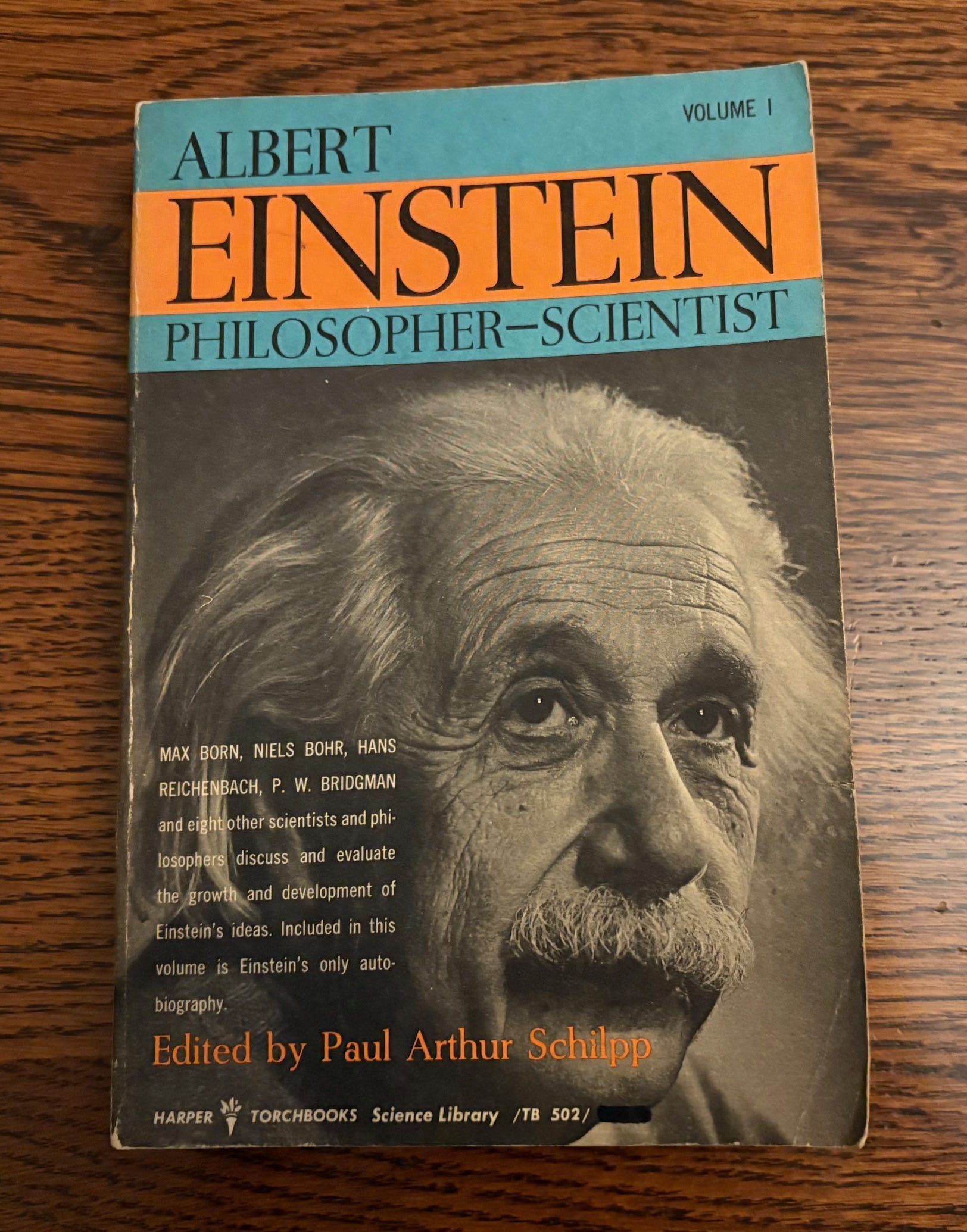 3) The cover of this 1959 volume about Einstein boasts the inclusion of his “only autobiography”. The Autobiographical Notes (1946) are presented here side-by-side in English and German, but they still total just under 100 pages, which seems short for an attempt to explicate Einstein’s scientific achievements!