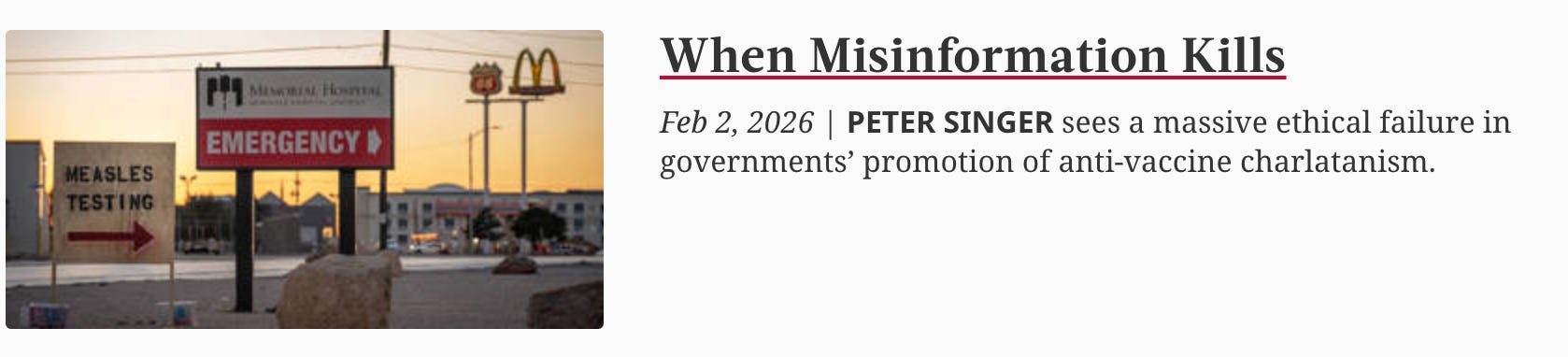 Singer’s most recent Project Syndicate piece, When Misinformation Kills, doesn’t really bring us into the realm of debating moral theory, however. It’s a pretty basic discussion of the clear-cut danger of spreading bad information about vaccines. As Singer tells us, vaccines are “among the most extensively tested medical interventions in history”. And as he discusses, vaccines save countless people from easily avoidable pain and death, every year.