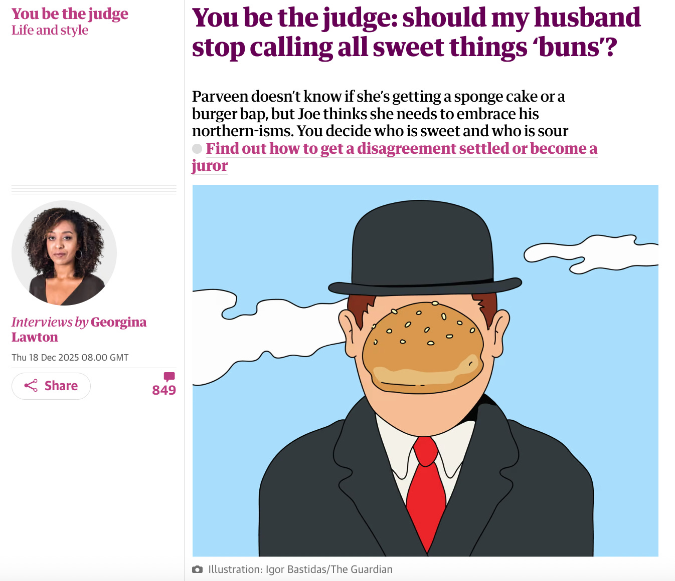 4) Last week, I read this Guardian piece about a couple arguing over the word ‘bun’: