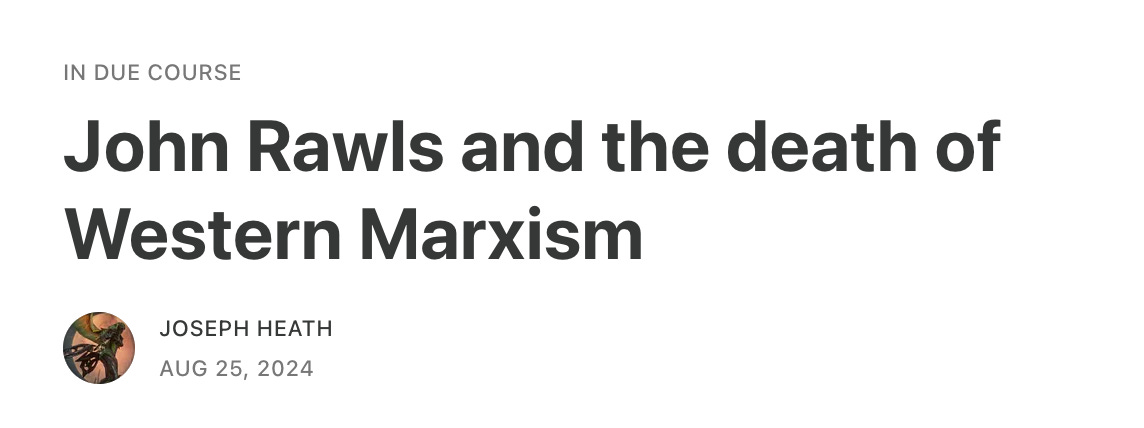 2) This week, I read this excellent 2024 overview piece by Joseph Heath about the twentieth-century ‘no-bullshit Marxists’. Heath argues that these exponents of modern analytic Marxism gave up their last few Marxist commitments after being convinced that Rawlsian liberal egalitarianism offered better answers to their concerns about capitalism than attempts to engineer the labour theory of value into proving the wrongness of worker exploitation. It’s a strongly written and argued piece, marred mainly by a few big over-claims, including: