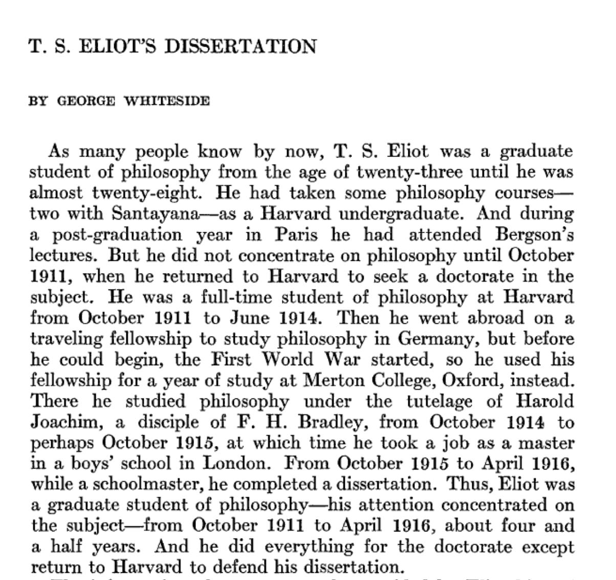 Of course, perhaps you want to tell me that the real problem is that I am expecting the standards of the analytic philosopher, when I am reading the work of a poet. That would be unfair to poets! But also, don’t forget that Eliot wrote a philosophy PhD thesis at Harvard, even though he didn’t take the exam required to attain the degree.