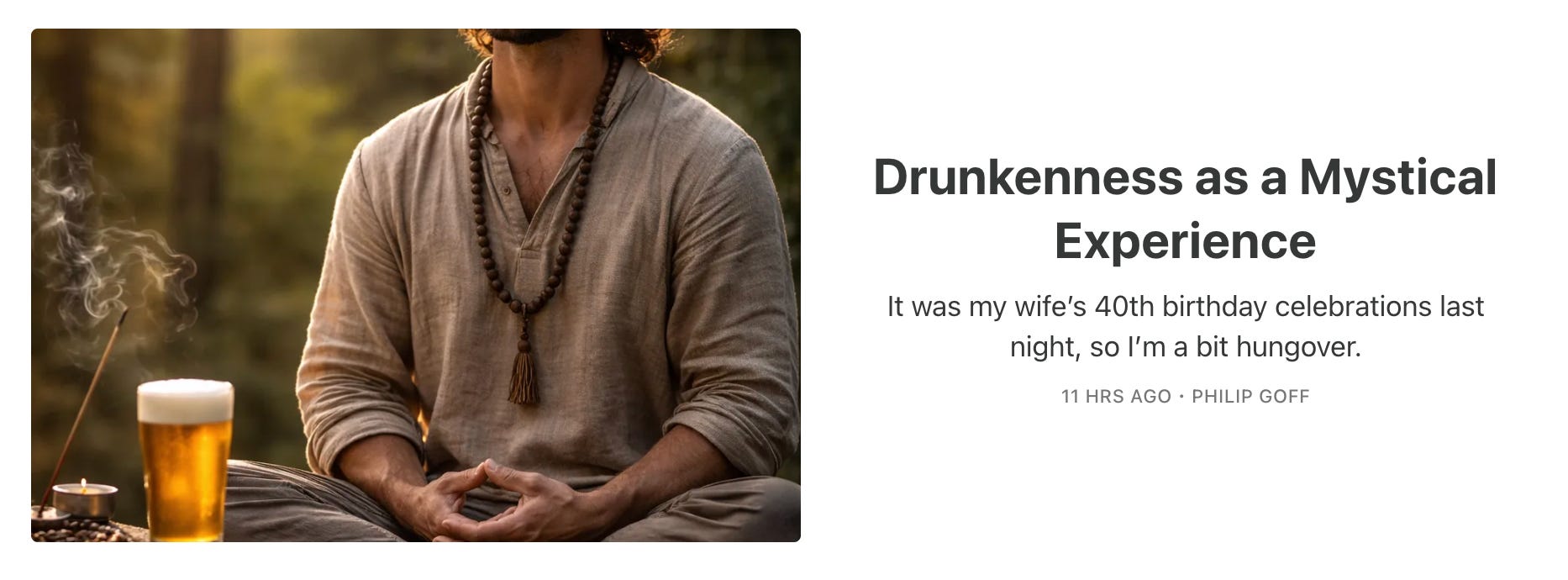 2) Today, I enjoyed this short post by my friend Philip Goff about William James on “drunkenness as a mystical experience”. Under the excuse of post-drunkenness, Philip’s post consists mostly in a quotation from The Varieties of Religious Experience (1902). The quotation itself features drunken-type writing: over the top, overly confident, slightly veering, fun but untrustworthy. This part will stick with me, however: