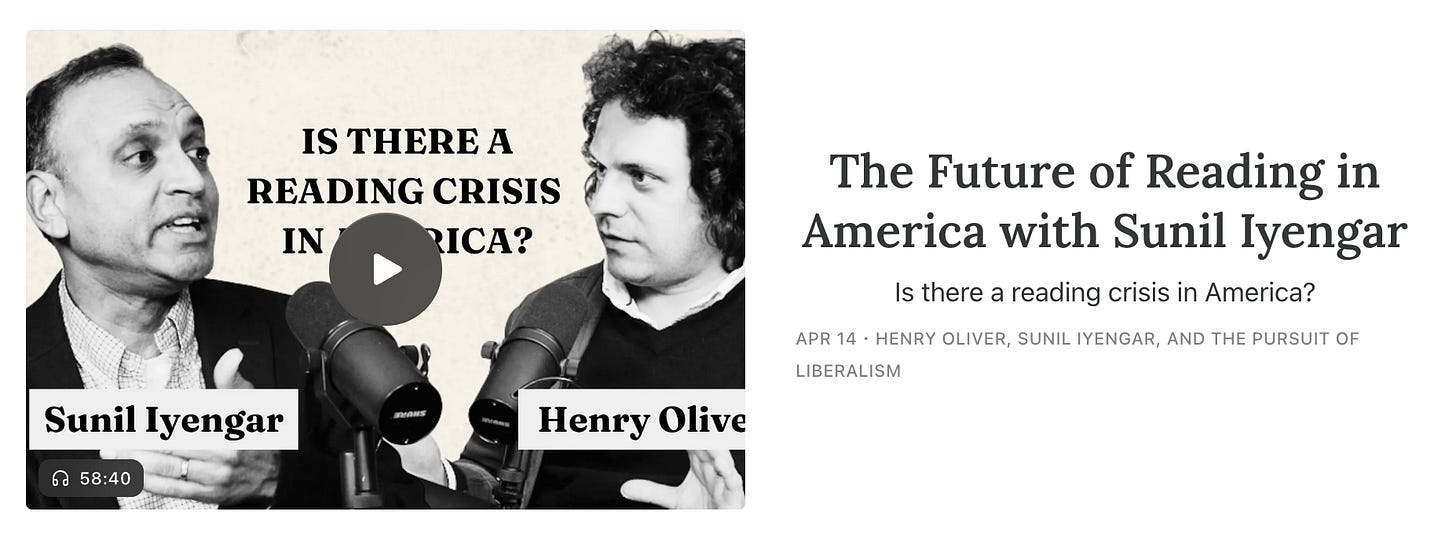 In the first episode, Henry talks with the excellent Sunil Iyengar about the value of reading. Is there a reading crisis in America? What’s the relation between reading rates and liberal culture? Watch, listen, or read, to find out!